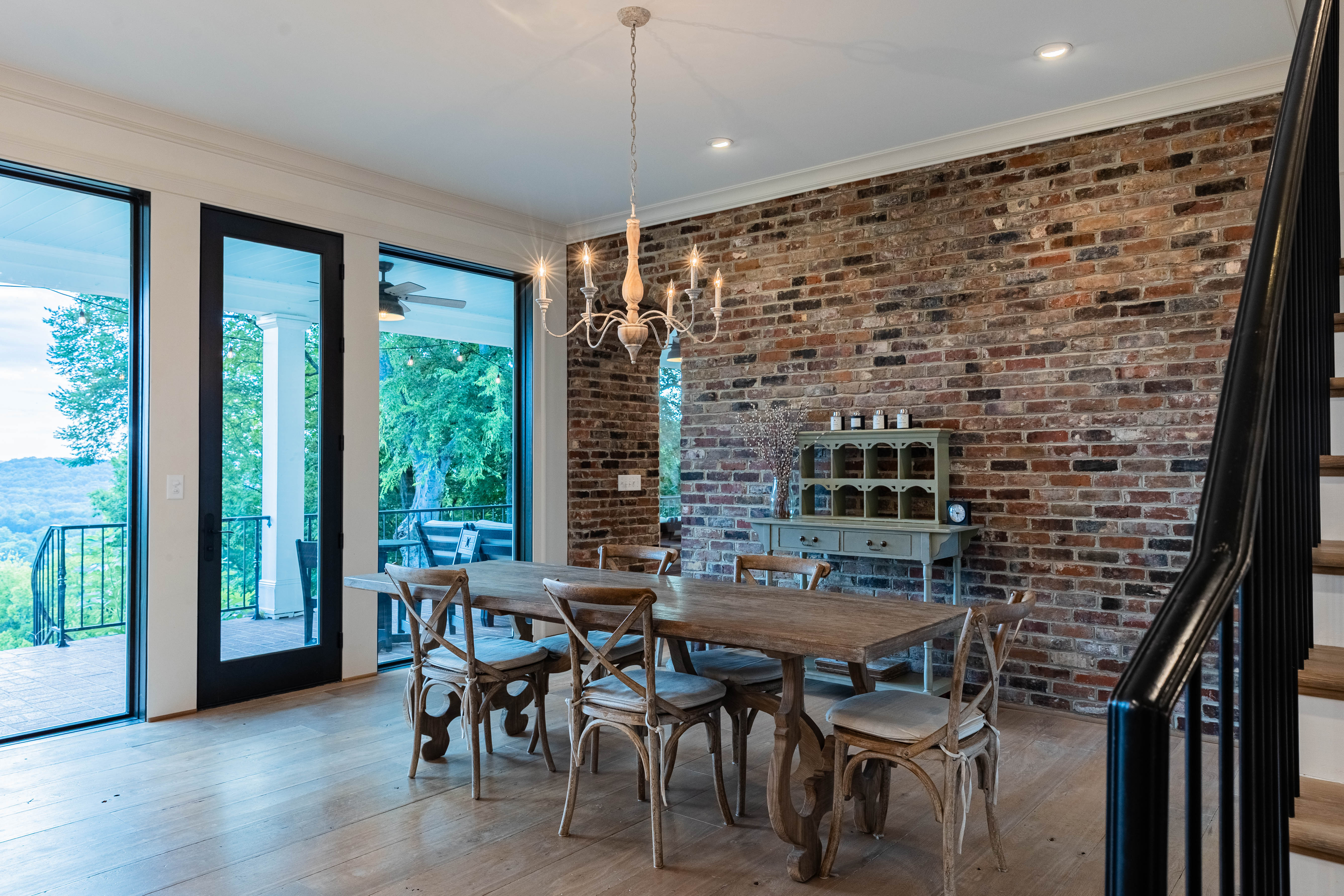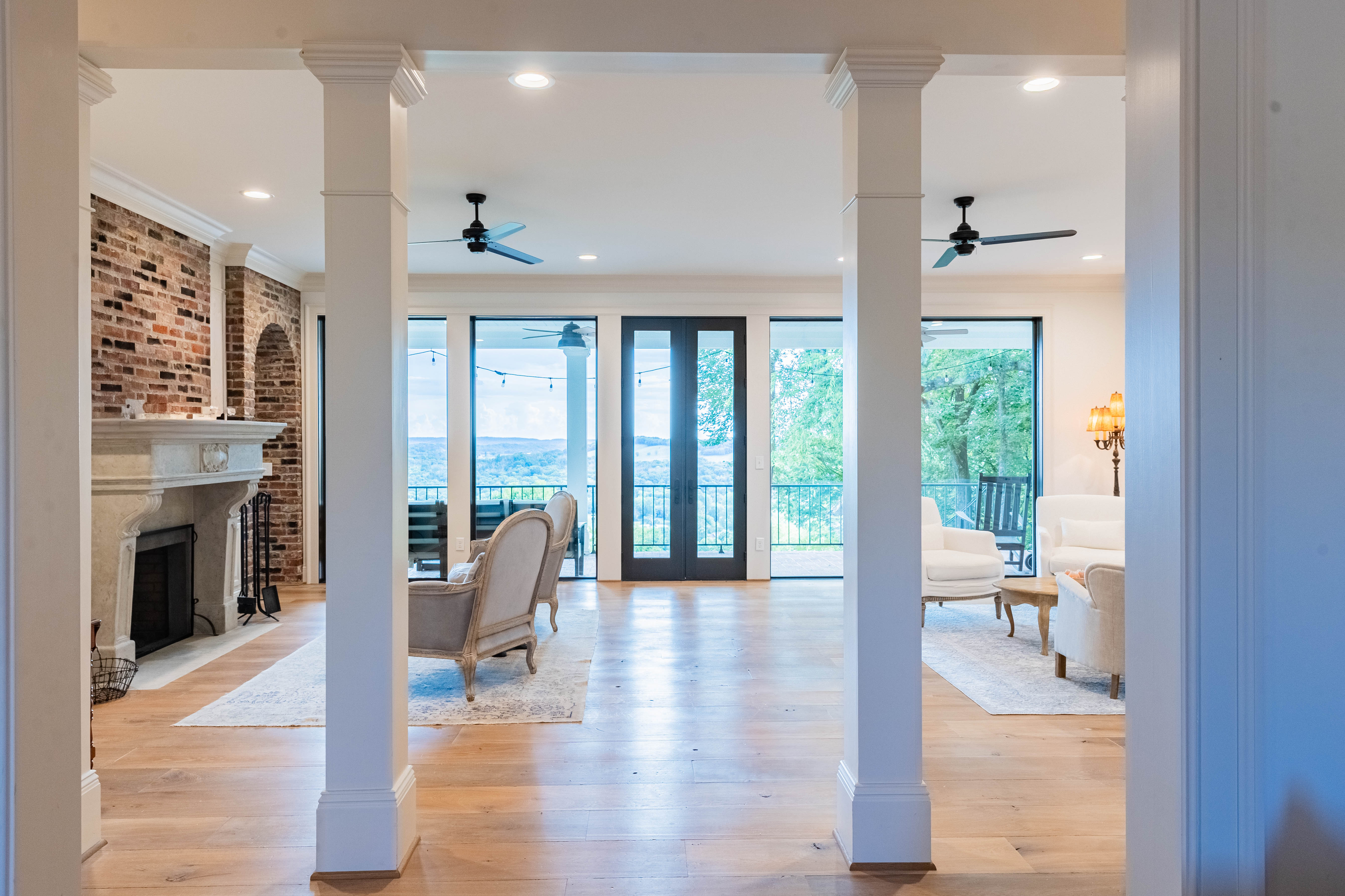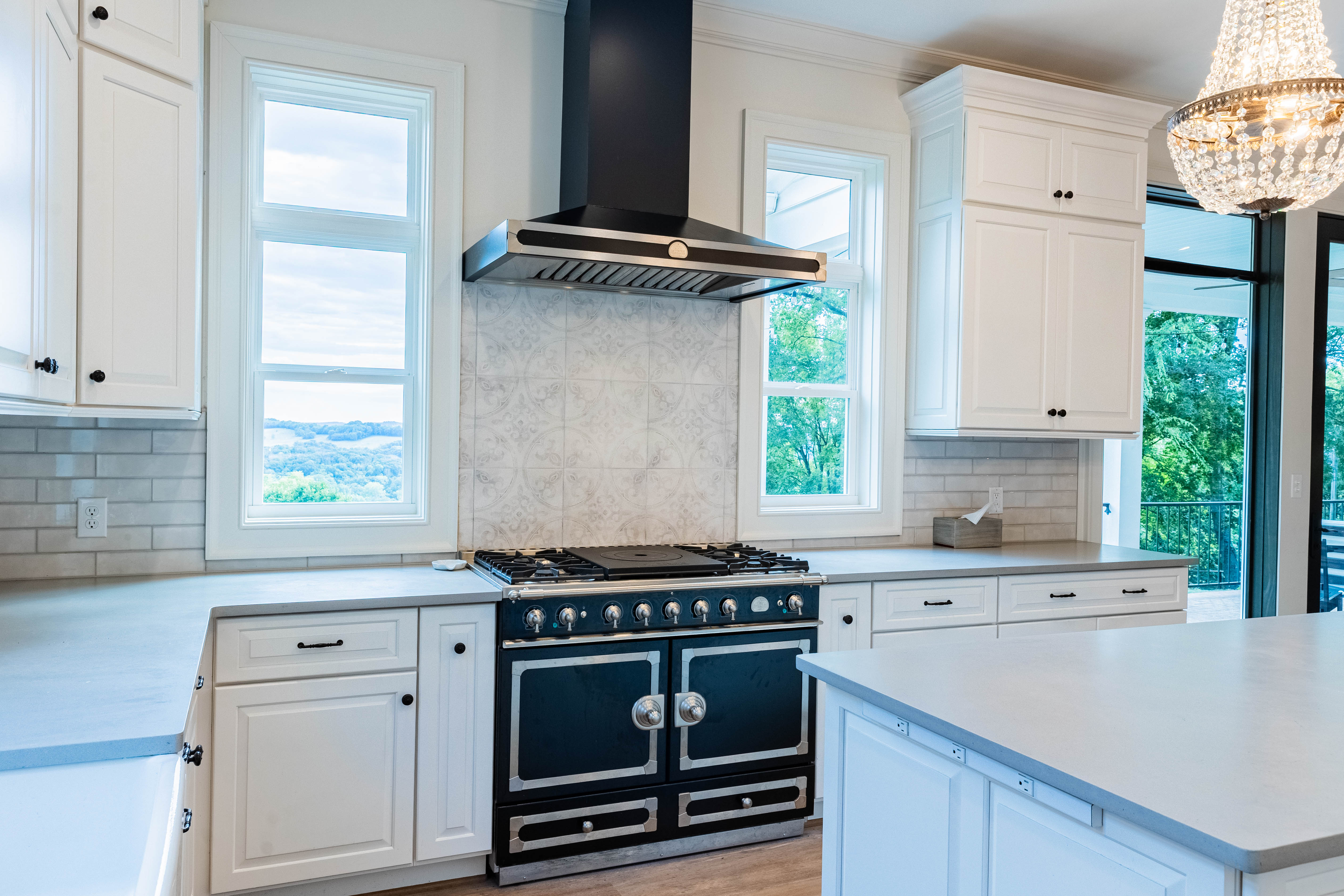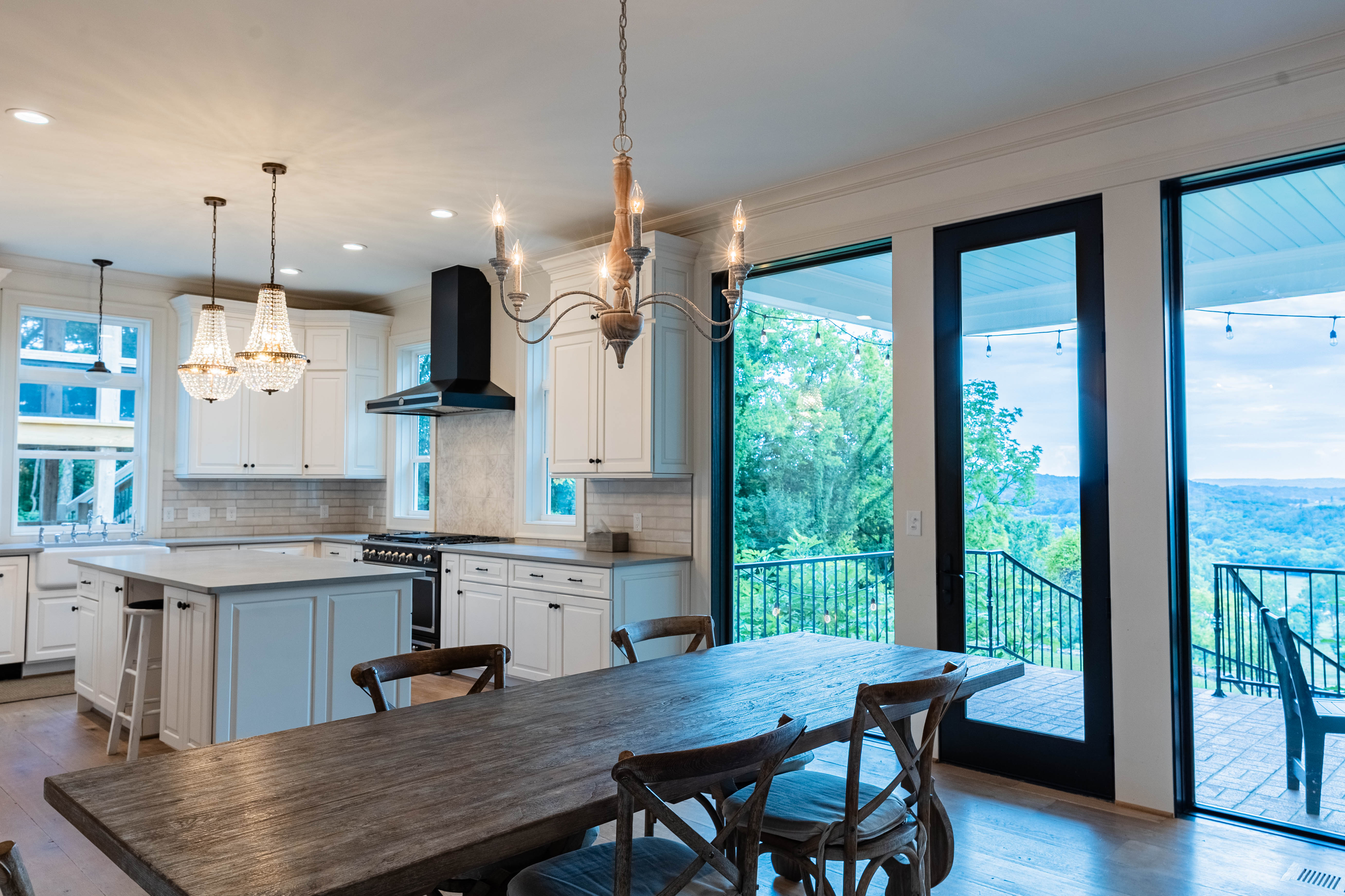 The family/living room is a showstopper, with floor-to-ceiling glass framing panoramic countryside views, flowing seamlessly into the kitchen and breakfast area. The chef’s kitchen features a La Cornue Château Series oven and range as well as a Sub-Zero refrigerator, built for both function and luxury.