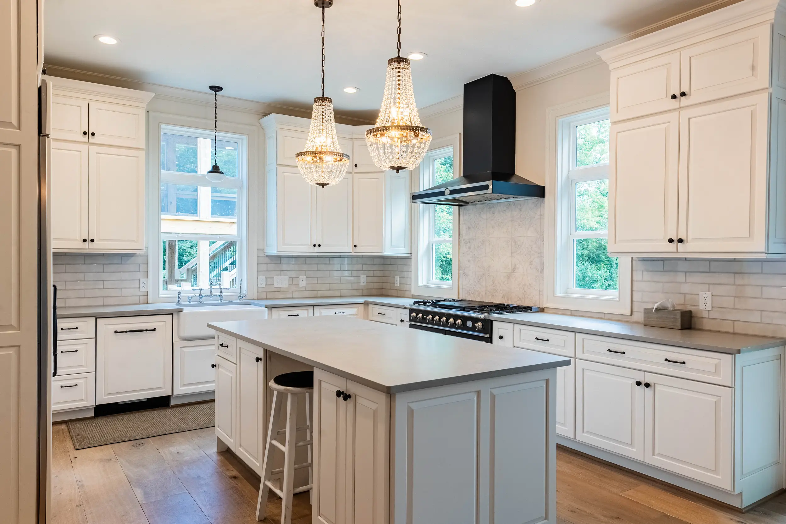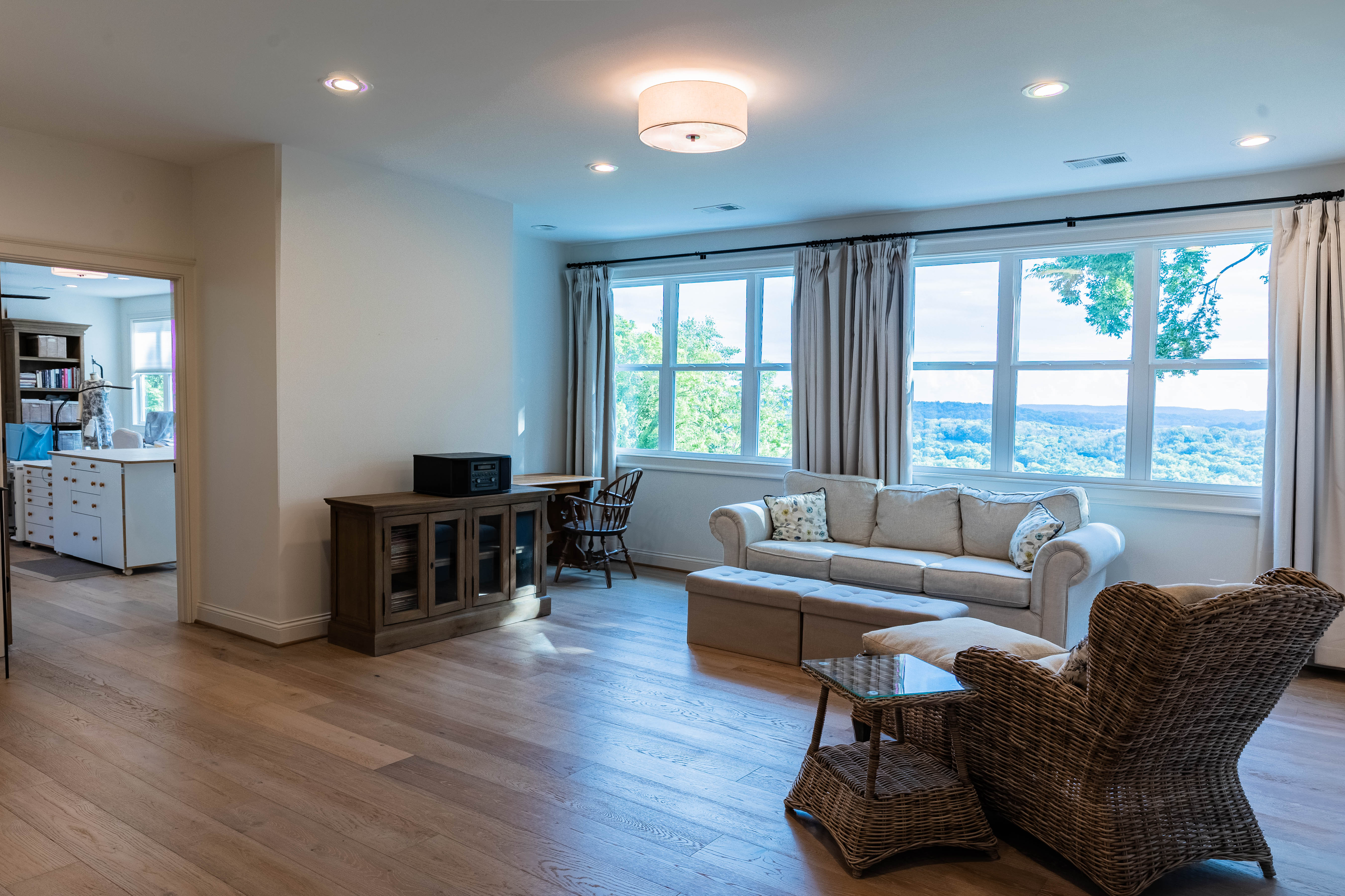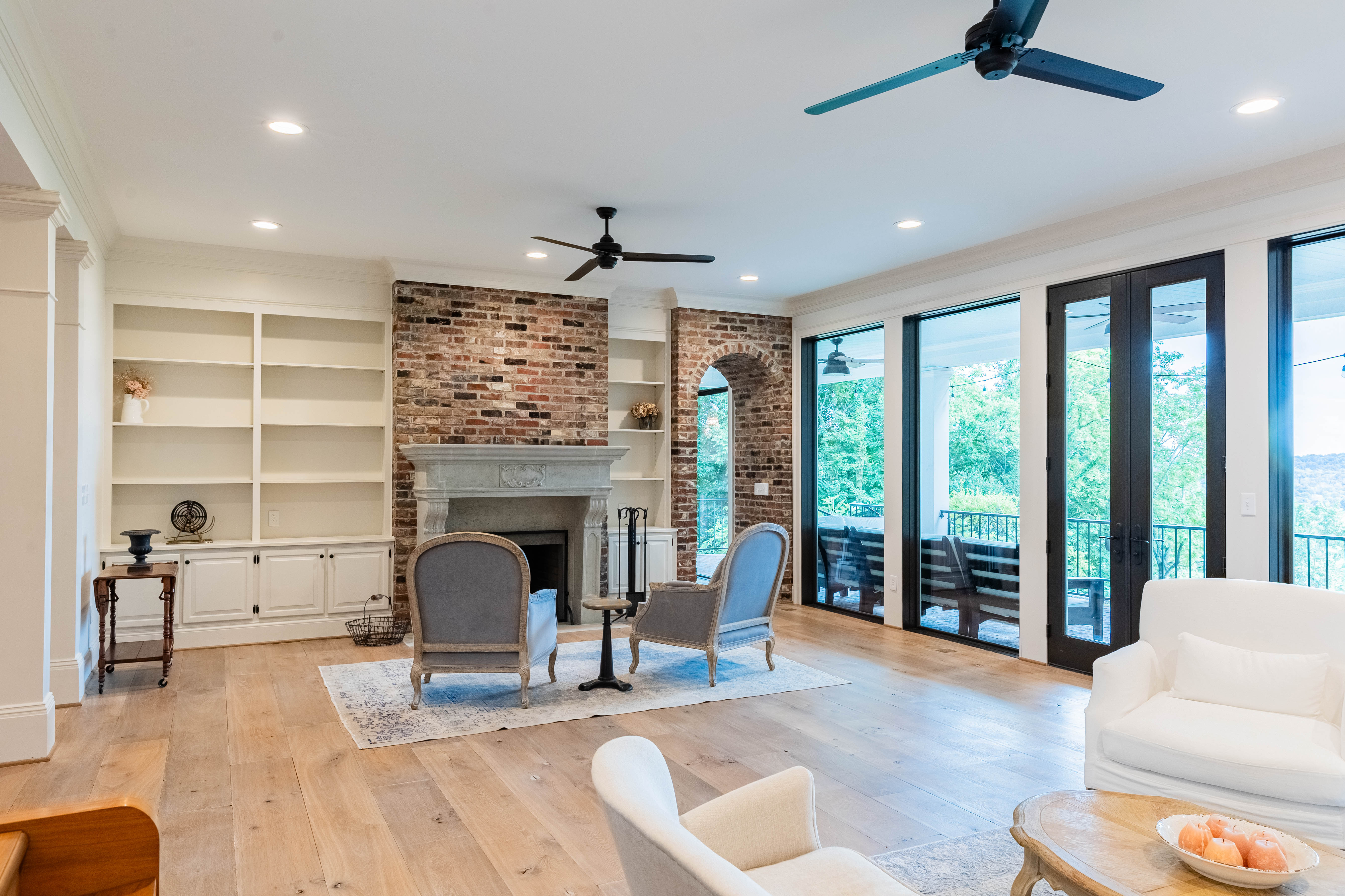The family/living room is a showstopper, with floor-to-ceiling glass framing panoramic countryside views, flowing seamlessly into the kitchen and breakfast area. The chef’s kitchen features a La Cornue Château Series oven and range as well as a Sub-Zero refrigerator, built for both function and luxury.