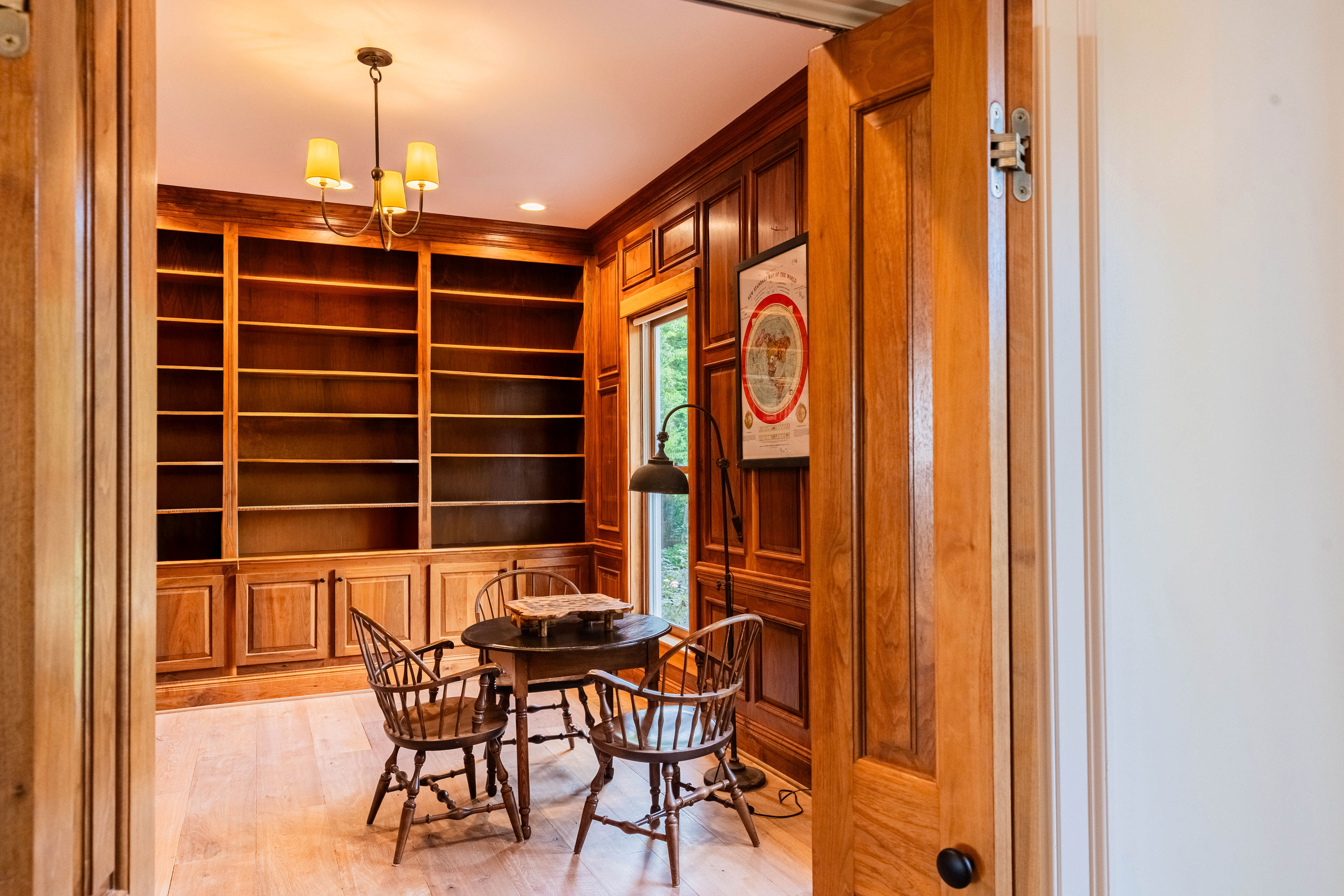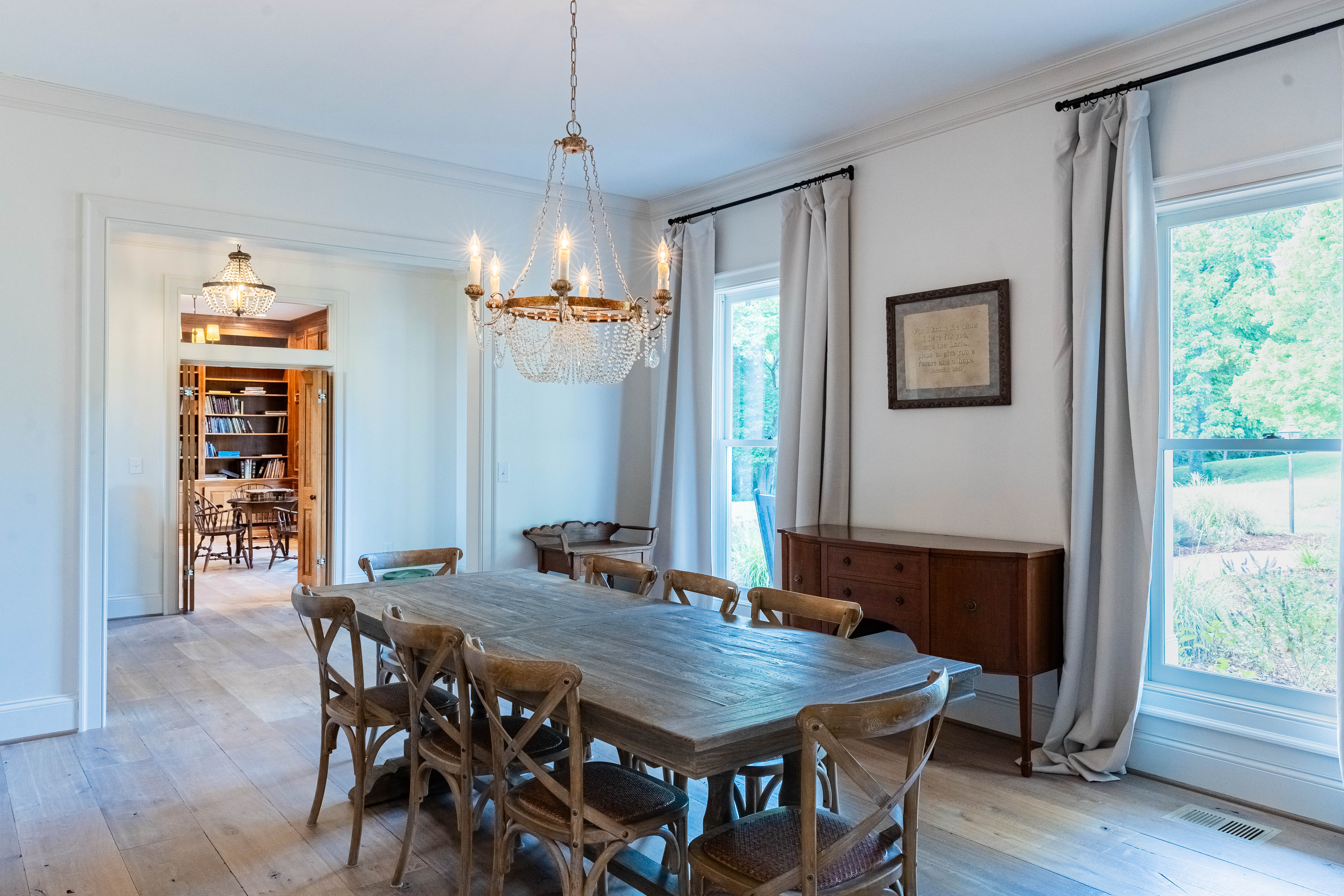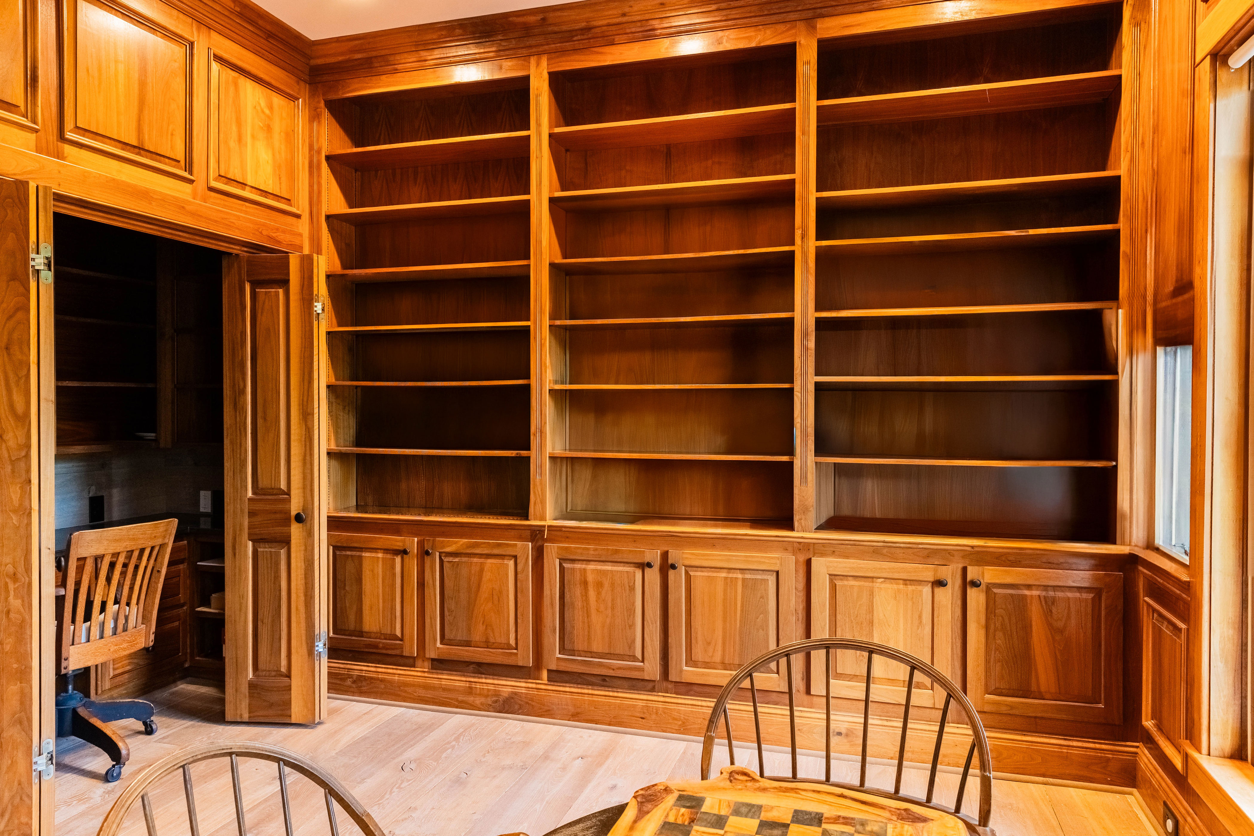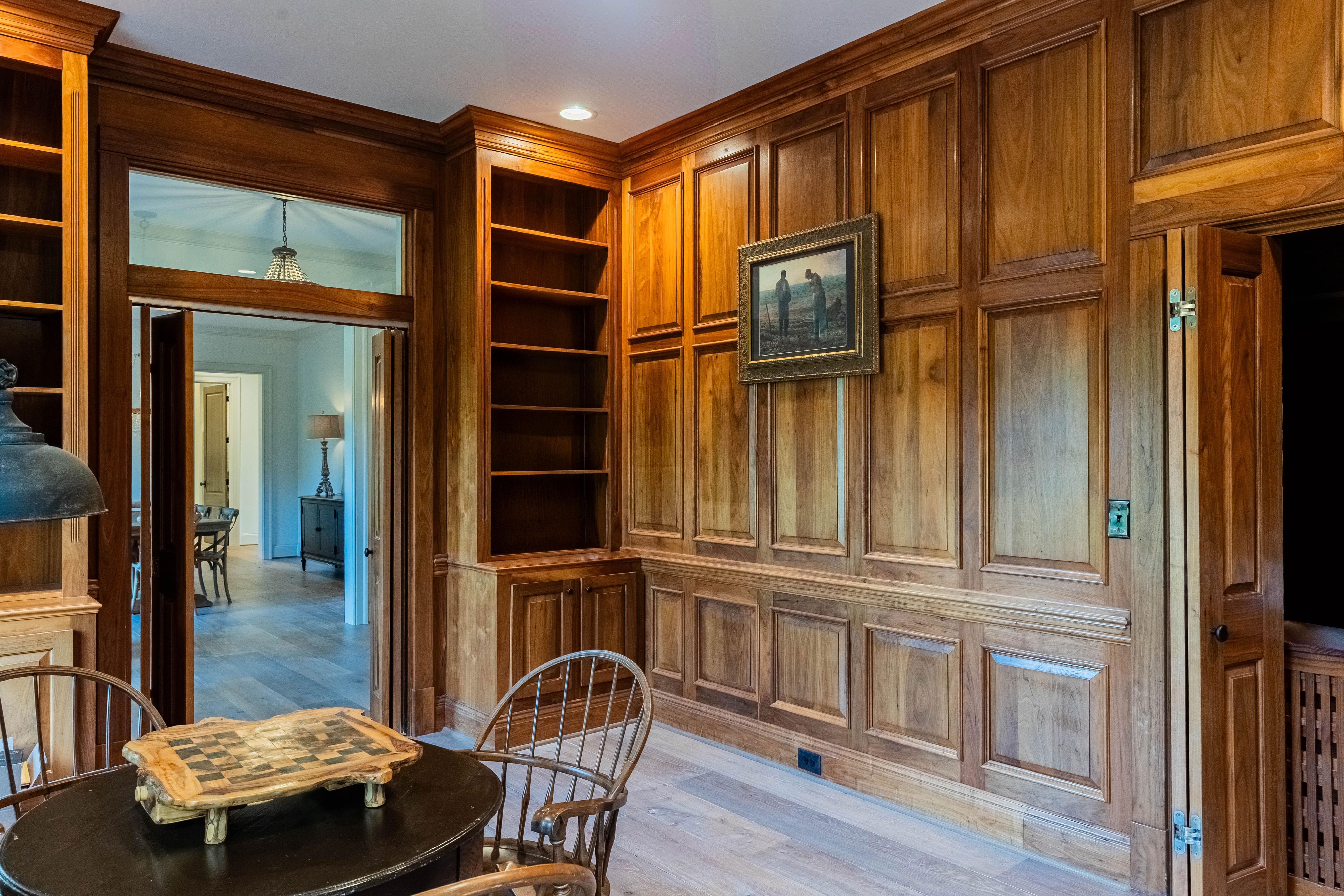 As you make your way up through the tree lined canopy drive, the property reveals a beautifully appointed home that feels like a mountain top retreat. Inside, comfort and elegance meet at every turn. The formal dining room is perfect for gatherings, while the library—with cherry hardwood paneling and endless shelving—offers timeless sophistication.